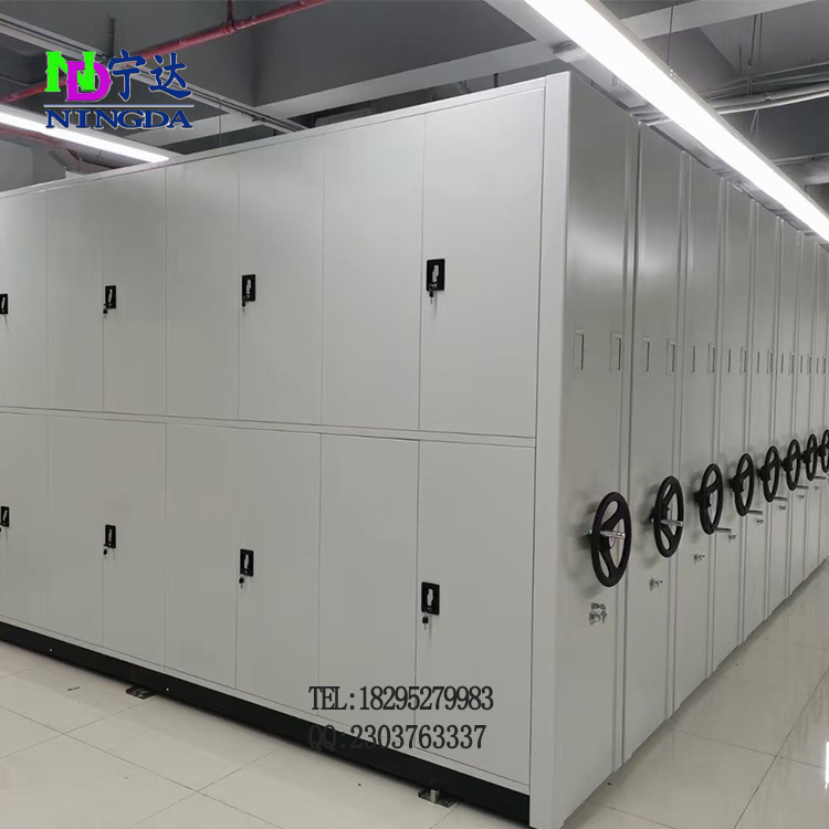2、密集架由正反上中下護(hù)板,起支撐作用的立柱、擺放檔案資料的擱板、門板、搖把系統(tǒng)、底盤系統(tǒng)、傳動系統(tǒng)、防塵系統(tǒng)組成。